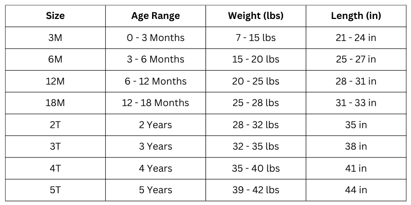 - Sizes Available: 3M, 6M, 12M, 18M, 2T, 3T, 4T, 5T