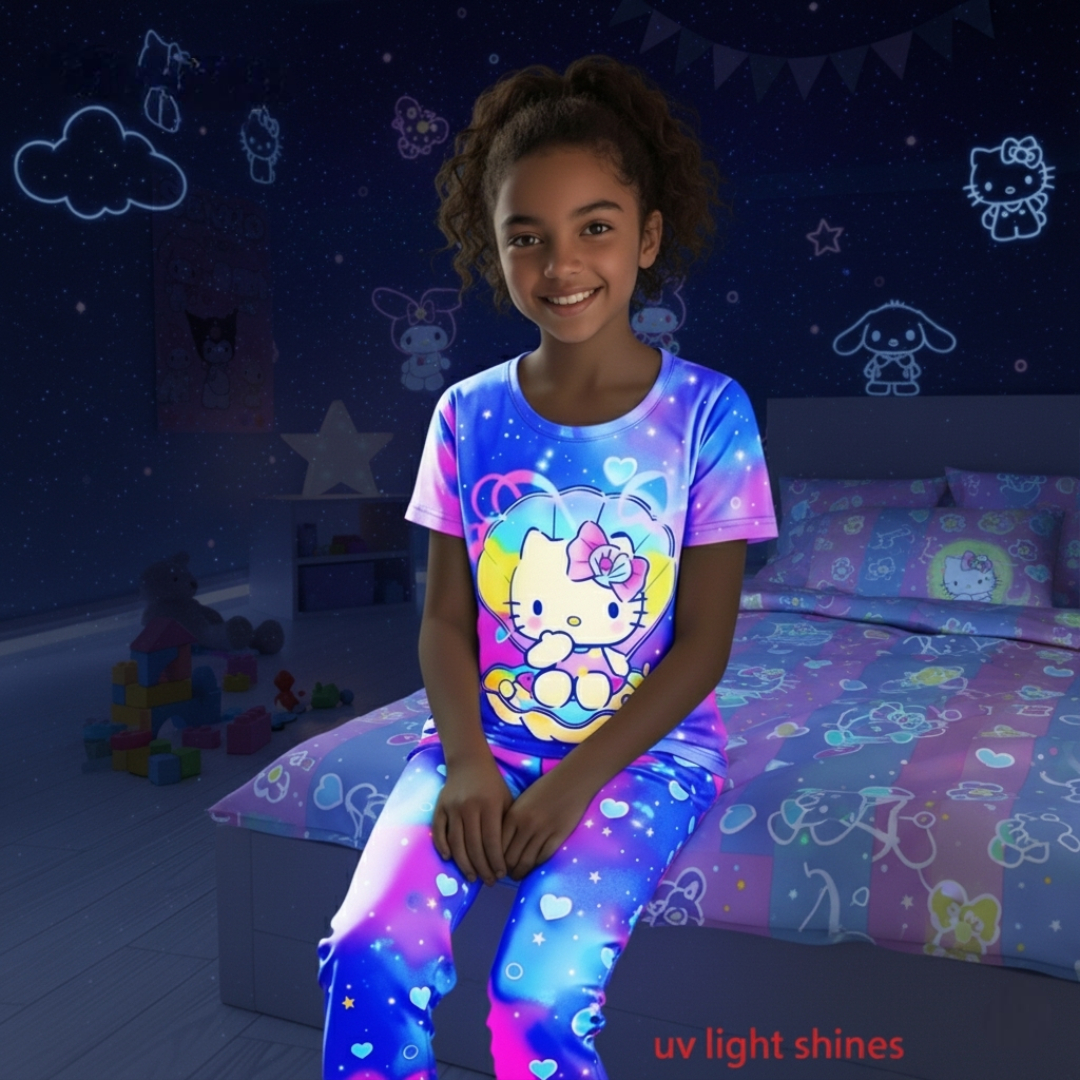 Make a magical experience with the Retardant Night Light Cartoon Print Pajama Set For Girls. Featuring the Kitty character, this pajama set includes a short-sleeve top and pants. The standout feature is the glow-in-the-dark effect, adding a look of fun to routines. Made from soft, airy polyester, this pajama set ensures comfort and style for a sleep.